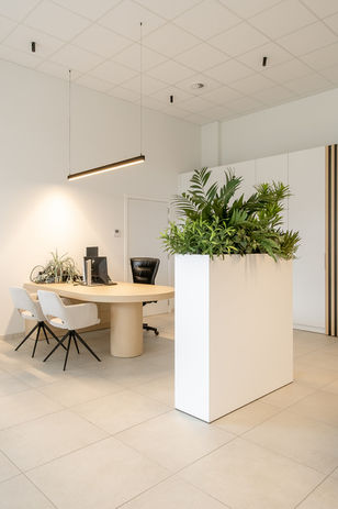 De grote vergaderzaal kreeg een luxueuze afwerking met comfortabele stoelen, kunstwerken en een houten deur voor extra privacy. Het werd een plek waar vergaderen aanvoelt als een moment van rust en focus.